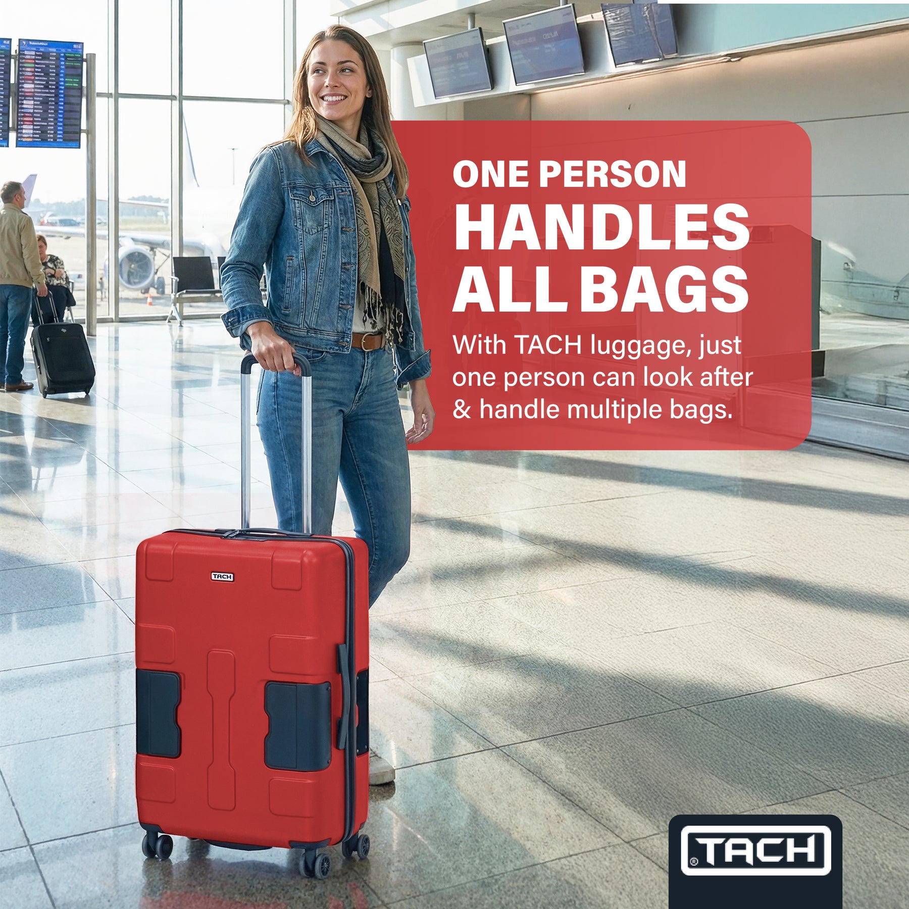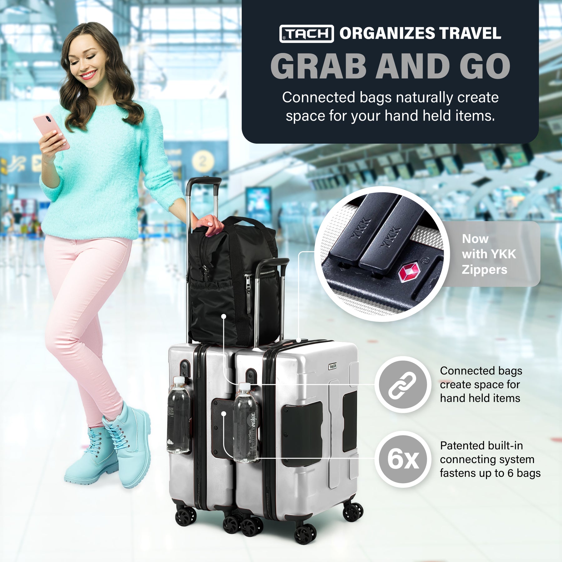 The patented TACH connection system is the most practical advancement in travel since the invention of wheeled luggage, giving one person the ability to handle multiple bags without the need for a trolley or assistance from a porter. The strategically placed D rings and adjustable pull strap allows 9 fully loaded TACH units to roll with ease. It features a flat top design that serves as a convenient shelf for your laptop bag, backpack, and other handheld items. Whether you're headed home for the holidays or traversing the globe, this smart luggage system makes it effortless to quickly move from point A to point B with all your luggage in tow.
